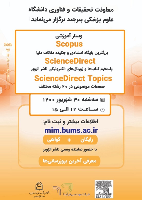 وبینار آموزشی  با عنوان «Scopus و ScienceDirect و ScienceDirect Topics» با حضور نماینده رسمی ناشر الزویر در ایران، برگزار می‌شود.