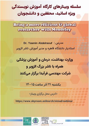 در ادامه سلسله وبینارهای آموزش نویسندگی توسط مرکز توسعه و هماهنگی اطلاعات و انتشارات علمی و موسسه نیماد با همکاری انتشارات الزویر، وبینار آموزشی" Bing a more efficient & global researcher with Mendeley" به زبان انگلیسی برگزار می شود.