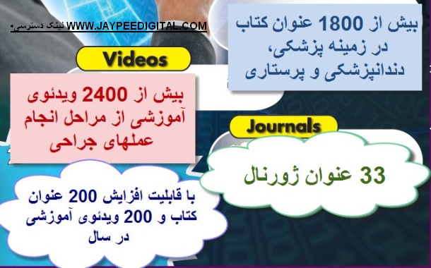 •·         JAYPEE DIGITAL محل دسترسی محصولات الکترونیکی ناشر شامل کتب الکترونیکی، ژورنال و ویدئوهای آموزشی پزشکی است.